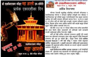 खजुरामा रहेको लक्ष्मी नारायण मन्दिरमा यहि भाद्र २४ गते एकादशीका दिनबाट महाआरतीको शुभारम्भ गर्ने निर्णय भएको लक्ष्मीनारायण मन्दिर ब्यवस्थापन समितिका अध्यक्ष शिवराज श्रेष्ठले बताए । उनले लक्ष्मी नारायण धामको स्थापनाको अभियानलाई सार्थक बनाउने उद्देश्यले मन्दिर परिषरमा भब्य भजन किर्तन र पञ्चेबाजा सहित महाआरतीको तयारी गरिएको बताए । निकट भविश्यमा अग्लो सुदर्शन चत्र सहितको लक्ष्मीनाराणको मुर्ति स्थापना गर्ने अभियानलाई महाआरतीले सार्थक बनाउने अपेक्षा गरिएको उनले जनाए ।