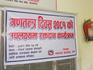आज १७औँ गणतन्त्र दिवस मनाइँदैछ नेपाली जनताको आन्दोलन र परिवर्तनको आकांक्षासँग जोडिएको गणतन्त्र स्थापनाका अवसरमा यो रक्तदान कार्यक्रम भेरि अस्पतालको परिसरमा रहेको नेपाल रेडक्रस सोसाइटीको रक्तदान कक्षमा उक्त कार्यक्रम संचालन गरेको हो ।