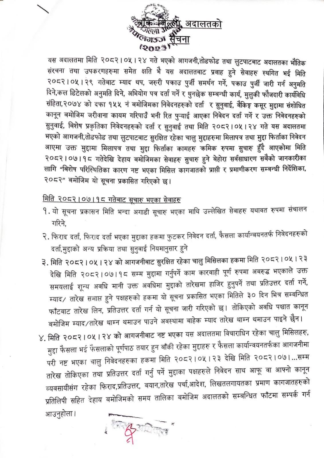 हाल अदालतमा मुद्दा दर्ता, फैसला कार्यान्वयन, प्रतिलिपि, बयान, आदेश, प्रमाणपत्र लगायतका नियमित सेवा पुनः सुरु भएका छन्।
