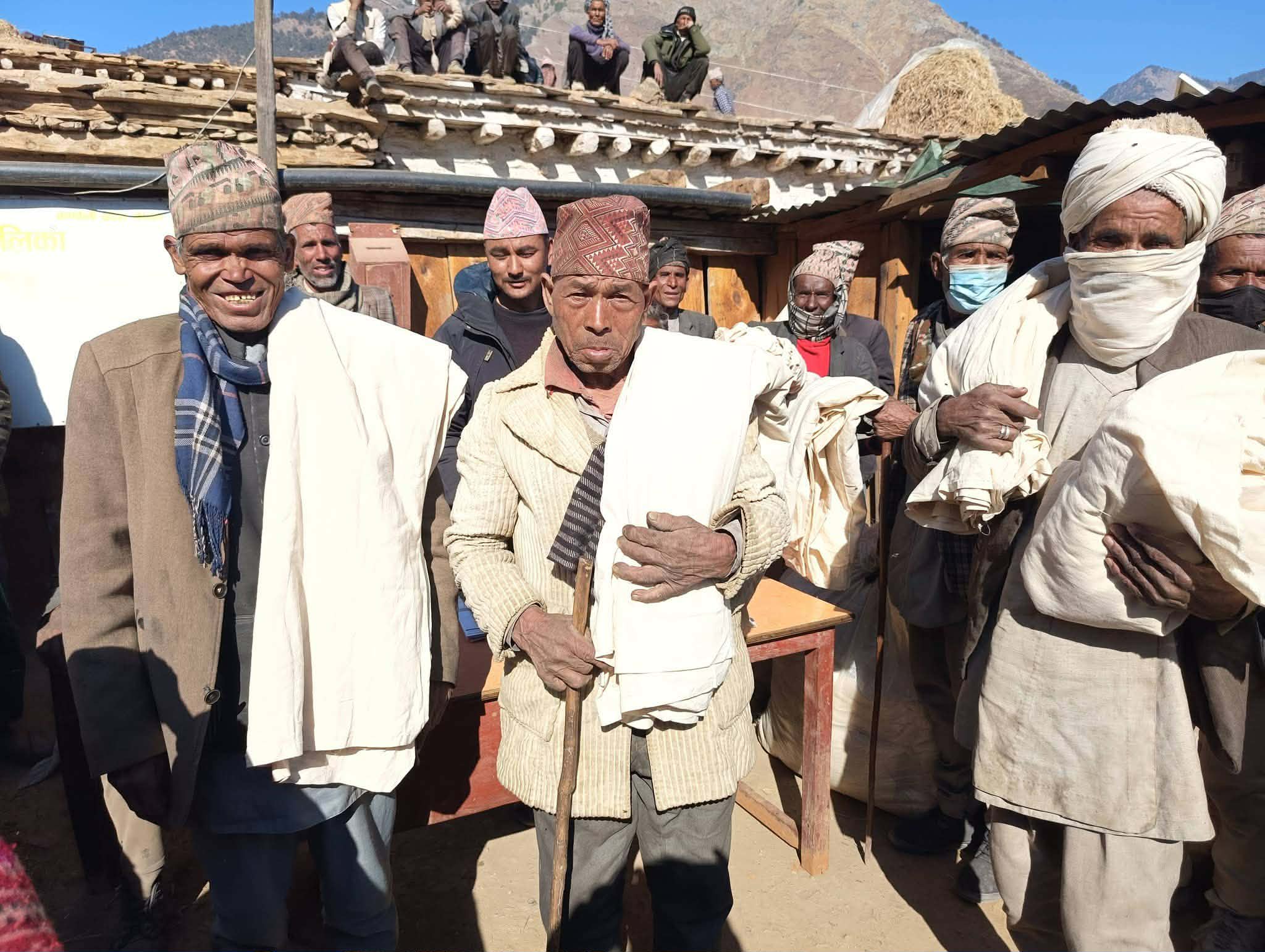बुधबार दिउँसो आयोजित कार्यक्रममा वडा अध्यक्ष श्री बबरजंग शाही ले वडा भित्रका अपाङ्गता भएका ८ जना, एकल महिला ३५ जना, ज्येष्ठ नागरिक ५७ जना तथा क्षेत्र तोकिएका ज्येष्ठ नागरिक ७७ जना गरी जम्मा १७७ जना लाभग्राहीहरूलाई न्यानो कपडा वितरण गर्नुभएको हो। वडा कार्यालयका अनुसार प्रत्येक लाभग्राहीलाई १० मिटरका दरले सुती कपडा प्रदान गरिएको छ।